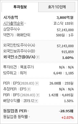 매출과 영업이익이 꾸준히 상승추세에 있으며, 부채비율 대비 유보율이 높아 준수한 편입니다. PER 11.36배, 외국인 비율이 제로라는 점은 체크해봐야 할 부분입니다.